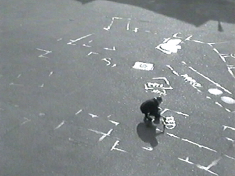 In Waterdrawing I draw the plan of a room from my memory, with a brush and pure water on an open square. I have never seen this room…it is described to me in a letter. The letter describes� what stands where in the room, as well as their relationships with each other expressed in subjective measurements by footsteps. While tracing the room, my footsteps give a rhythm to the marking of the lines. The sunlight makes the lines white and mirror -like, though the heat makes the drawing disappear.